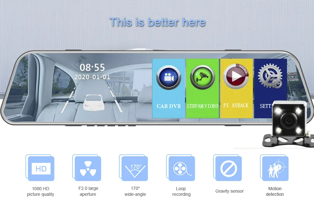 1920*1080 front dashboard camera and waterproof rear camera guarantee full HD video quality. You can also preview the road clearly whether view the screen from the front or from the side.